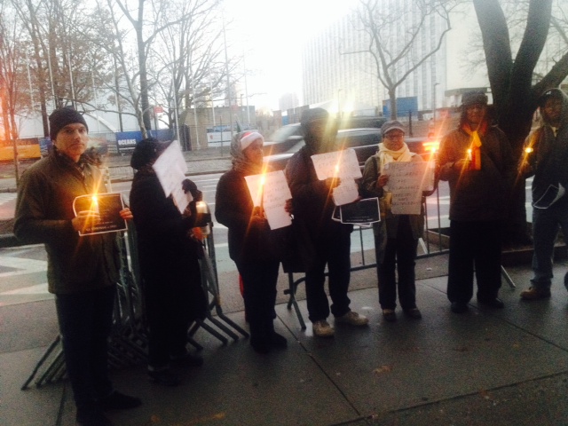 New York, NY (December 10, 2013) — Despite uninviting snow storm in New York City, ESAC and protesters held a candlelight vigil in front of Saudi Arabian Mission to United Nations in memory of Ethiopian Migrant Victims of Saudi Arabian abuse.